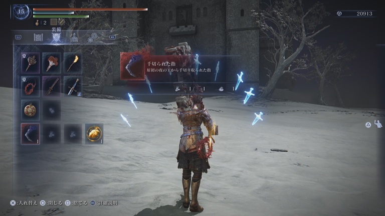 ナメレスを倒すと所持品に「千切られた指」が出現する。
