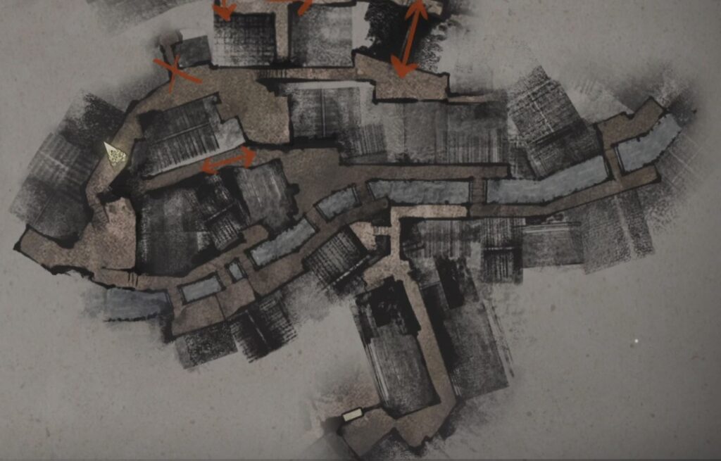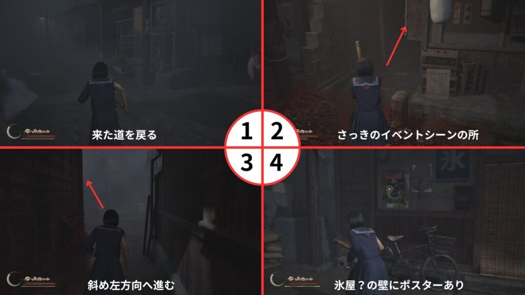 先に進みすぎると戻れなくなるので2のポスターを調べたらすぐに来た道を戻り先ほどイベントシーンが流れた辺りに移動しよう。